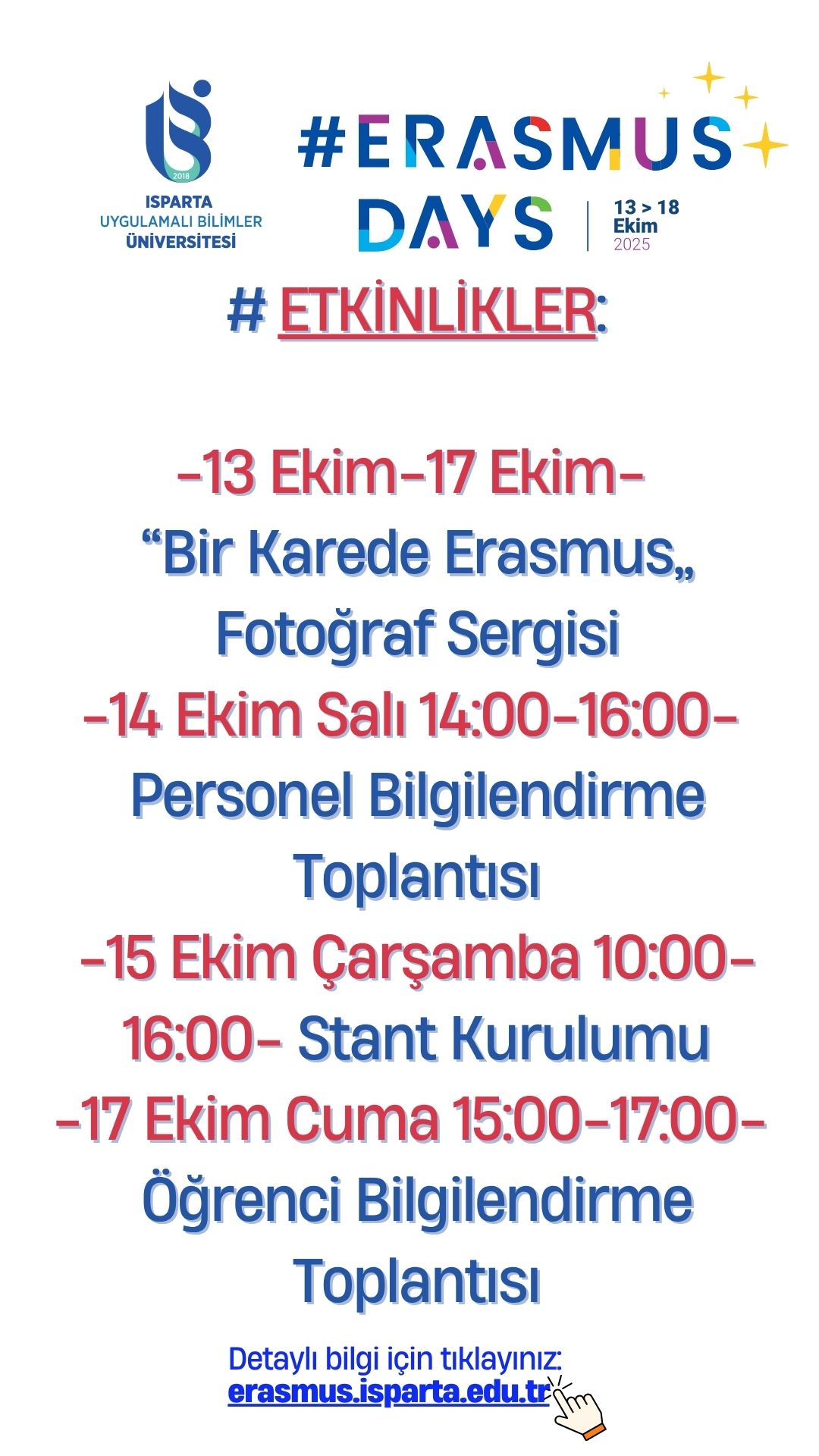 2025 yılı #ErasmusDays etkinlikleri kapsamında ISUBÜ Erasmus Koordinatörlüğü olarak personel ve öğrencilerimiz için çeşitli etkinlikler planlanmıştır. Etkinliklerle ilgili detaylar aşağıdaki gibidir: